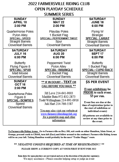 Much of our "extra" info and events are announced on FaceBook. Please Follow the Farmersville Riding Club!